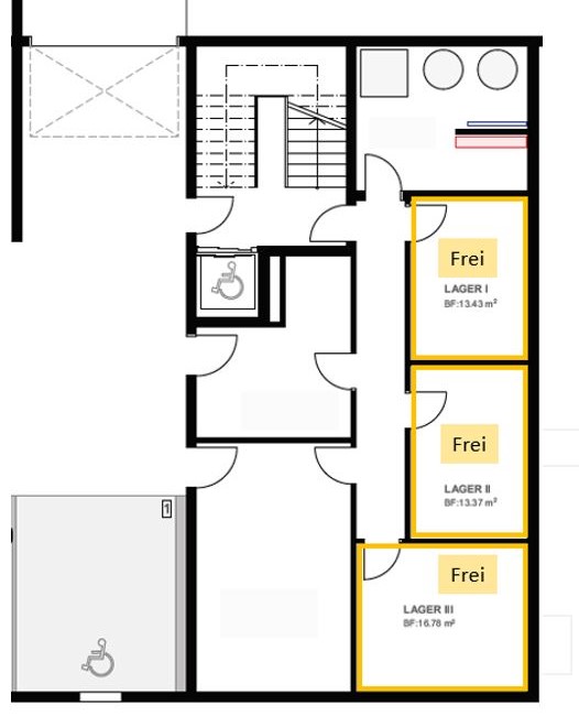 Der Lift bring Sie direkt aus der Tiefgarage zu den Räumen. Besucherparkplätze stehen vor dem Gebäude zur Verfügung. Auf der Etage befinden sich Toiletten mit einer Dusche sowie einem geräumigen Abstellraum.